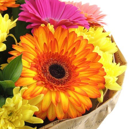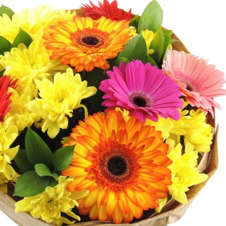 - Композиция: внизу разноцветные мерцающие букеты, вверху облако золотых хризантем.