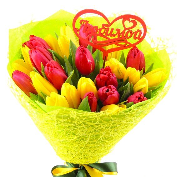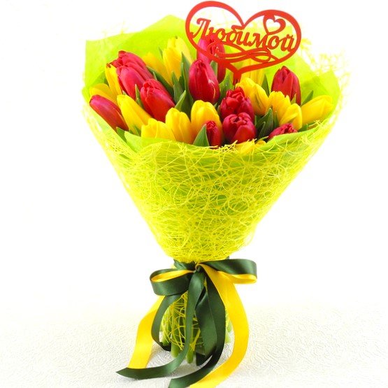 Высота букета: 35 см Состав букета: Тюльпан микс: 25 шт. Упаковка: сизаль, фетр, лента цветная, декор "Любимой"