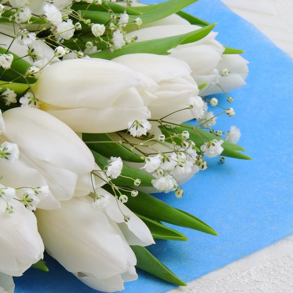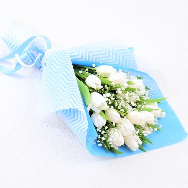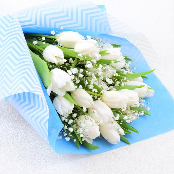 Высота букета: 35 см Состав букета: Тюльпан белый: 25 шт. Гипсофила. Упаковка: пленка, лента цветная