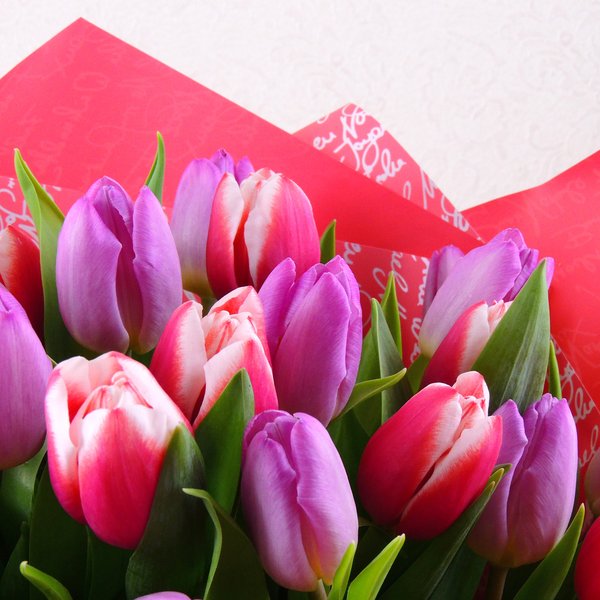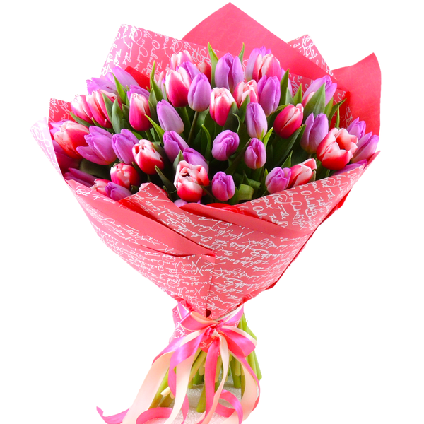 Высота букета: 50 см Состав букета: Тюльпаны микс: 45 шт. Упаковка: пленка цветная, лента атласная.