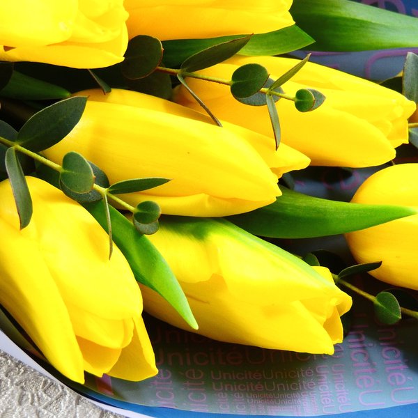 Заказ: ОТ 5 БУКЕТОВ!Высота букета: 30 см Состав букета: Тюльпаны желтые: 9 шт. Эвкалипт. Упаковка: пленка, лента цветная**