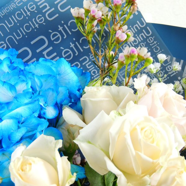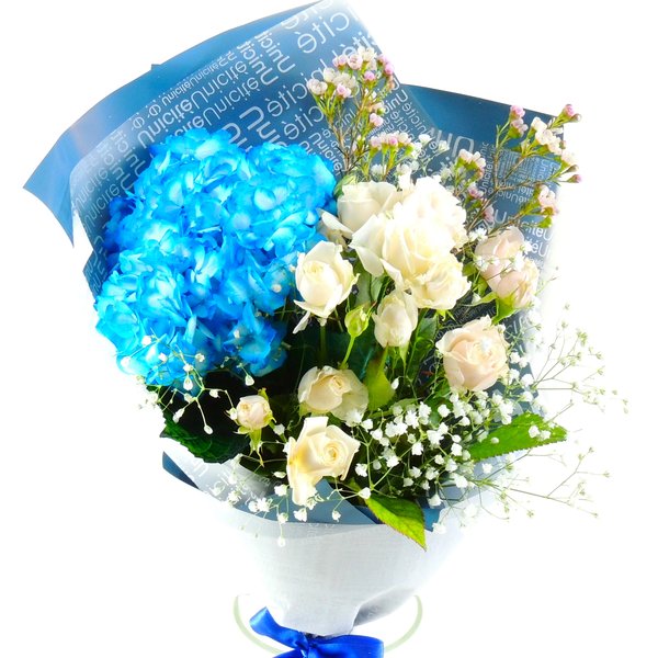 Заказ: ОТ 5 БУКЕТОВ!Высота букета: 35 см Состав букета: Гортензия голубая: 1 шт. Роза кустовая, гипсофила, хамелациум. Упаковка: пленка, лента цветная**