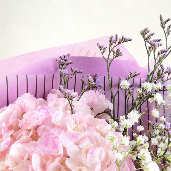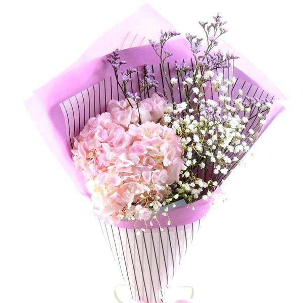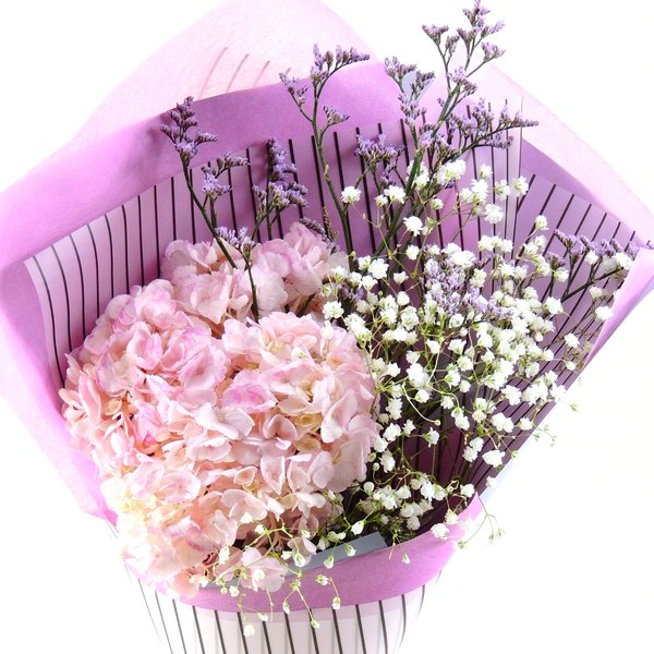 Заказ: ОТ 6 БУКЕТОВ!Высота букета: 35 см Состав букета: Гортензия розовая: 1 шт. Гипсофила, лимониум. Упаковка: пленка, лента цветная**