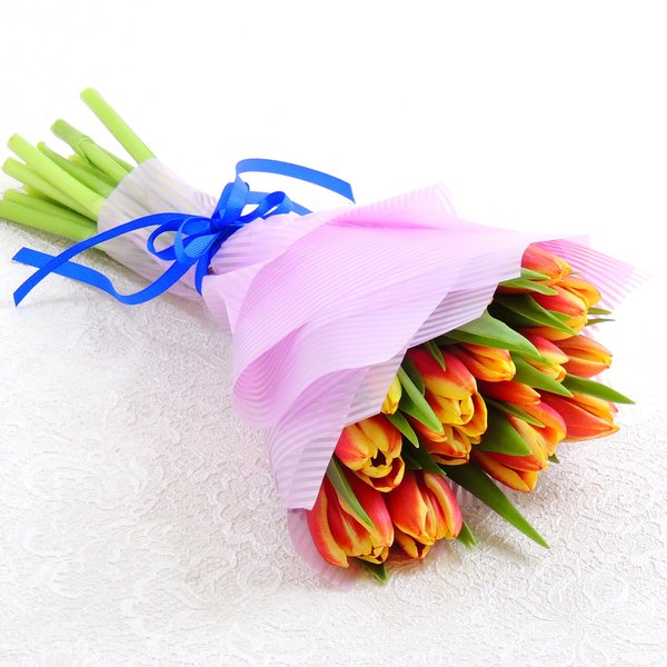 Высота букета: 35 см Состав букета: Тюльпан красно-желтый: 11 шт. Упаковка: фетр, лента цветная.