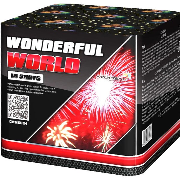 Красно-зеленые пионы с треском. Красная хризантема с переходом в трещащие огни. Золотые трещащие пальмы. Зелено-синий пион с переходом в трещащие огни.