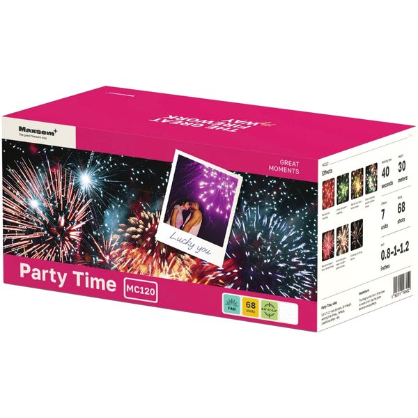 Красочный разнокалиберный фейерверк с яркими эффектами: красные и зелёные хвосты, фиолетовый, золотой строб, хрустящий хвост к хризантемам с ивой.